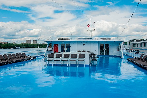 Расслабьтесь под лучами солнца, загорая и наслаждаясь захватывающими видами во время вашего круиза на теплоходе «Ленин».